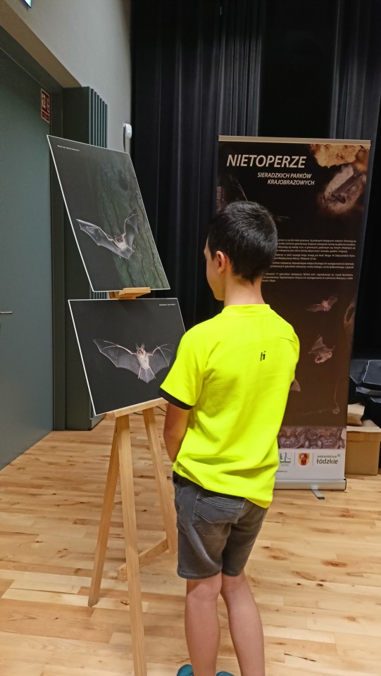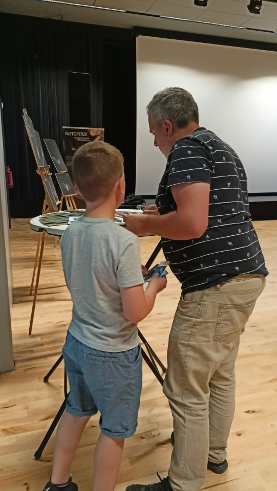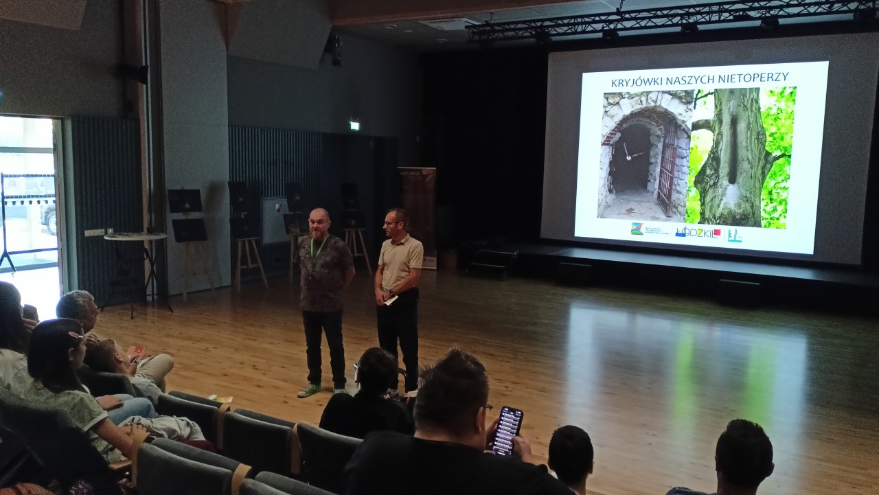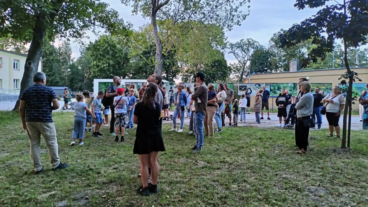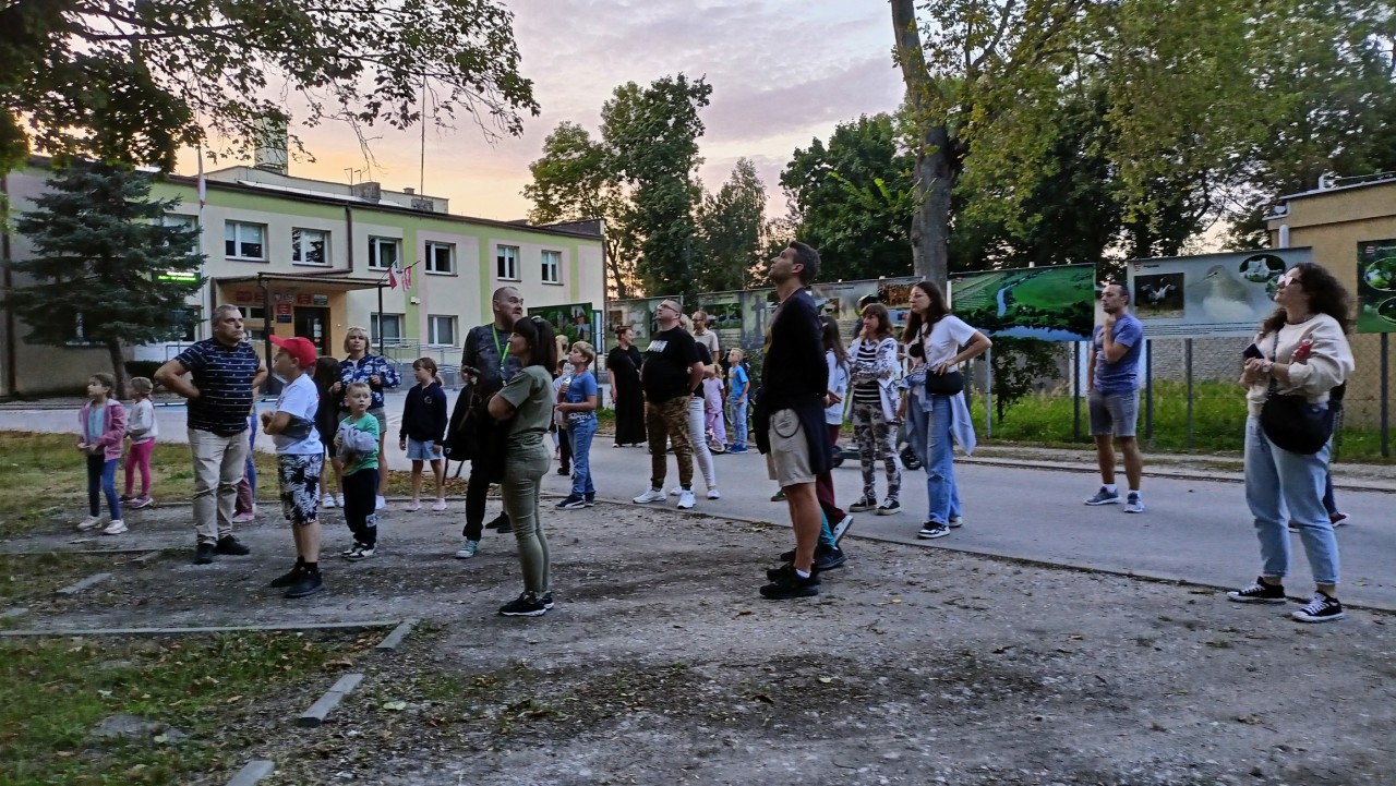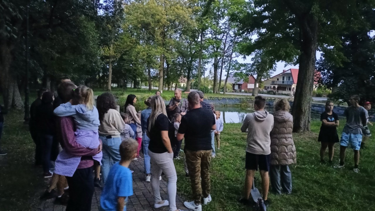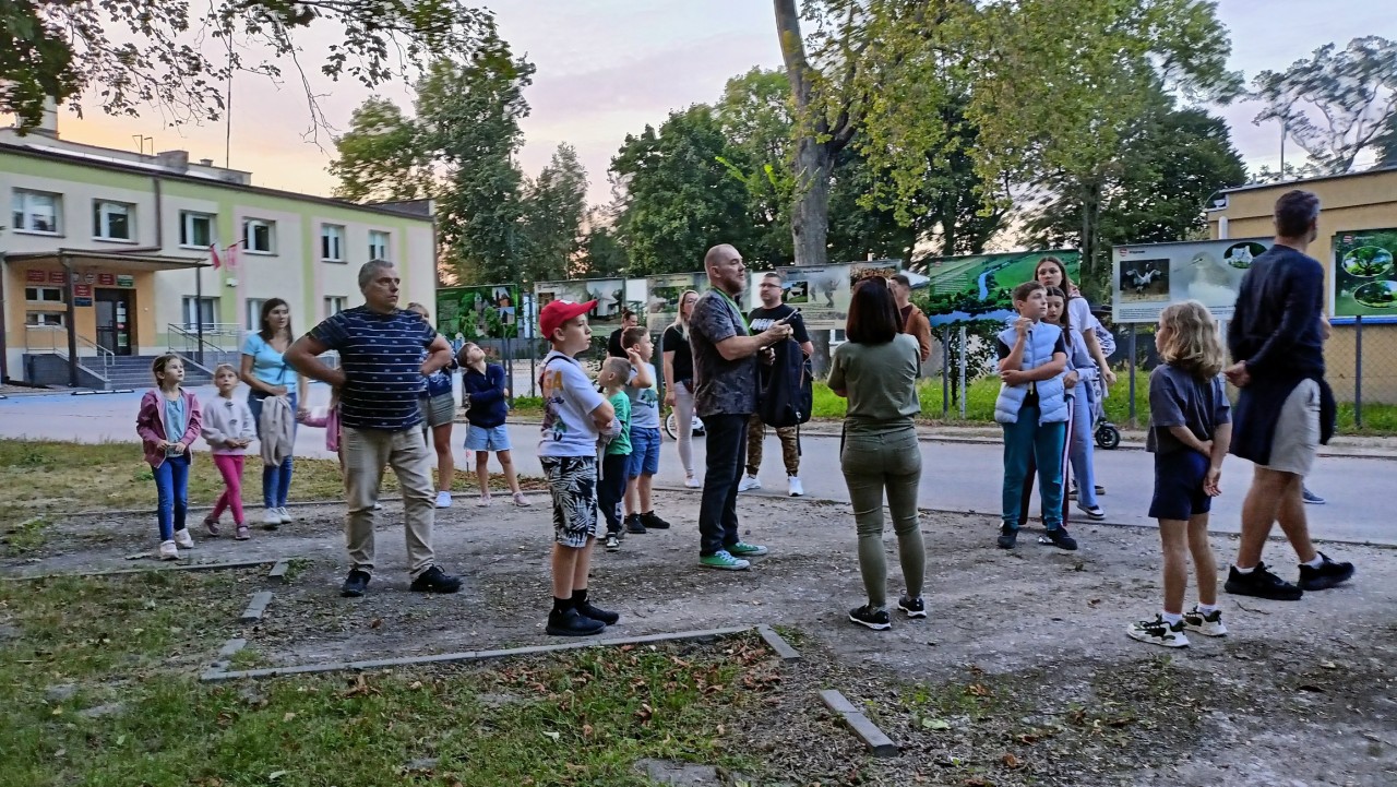 W środę natomiast, 27.08.2025 już po raz trzeci „Noc Nietoperzy” współorganizowaliśmy z Gminnym Ośrodkiem Kultury i Sportu w Zapolicach. Na początku odbyły się zajęcia kameralne dotyczące różnorodności kryjówek letnich i zimowych naszych nietoperzy. Później, liczna grupa dużych i małych fanów przyrody przeszła do parku gdzie obserwowaliśmy i słuchaliśmy za pomocą detektora ultradźwiękowego minimum trzy gatunki nietoperzy. Duże zainteresowanie wzbudził wylot (jeszcze przy jasnym niebie ułatwiającym bezpośrednie obserwacje) ponad 20 borowców wielkich z kolonii znajdującej się w dziupli starego drzewa.