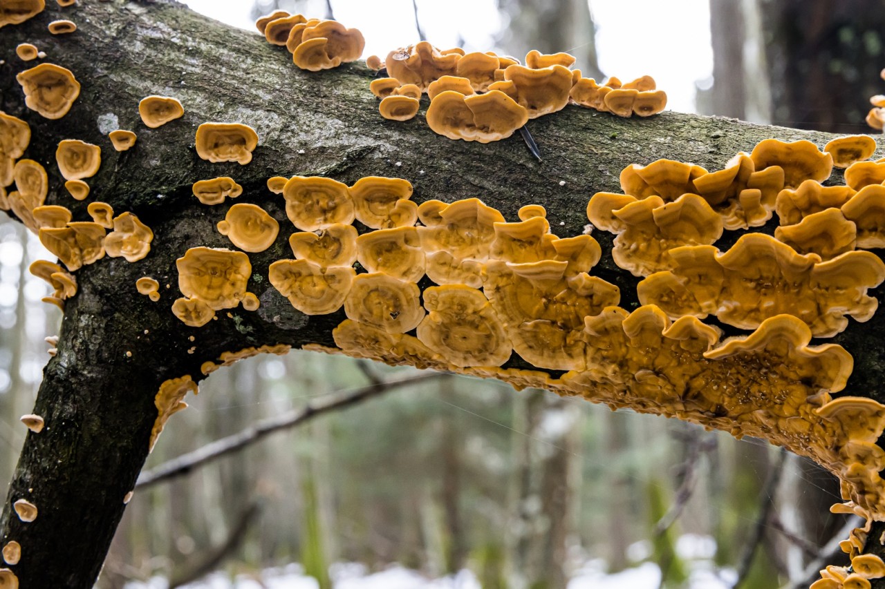 • Festiwal barw na pniach: Niezwykłe grzyby nadrzewne, takie jak wzorzysty wroślak różnobarwny oraz subtelny skórnik szorstki, które choć pospolite dodają kolorytu szarościom przedwiośnia.