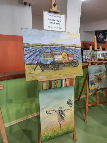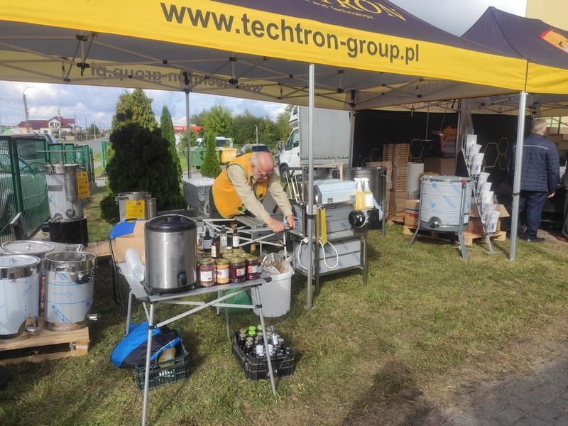 Na terenie szkoły zorganizowano liczne stoiska wystawiennicze, oferujące materiały edukacyjne, sprzęt pszczelarski oraz produkty pszczele, w tym miody i ich przetwory.